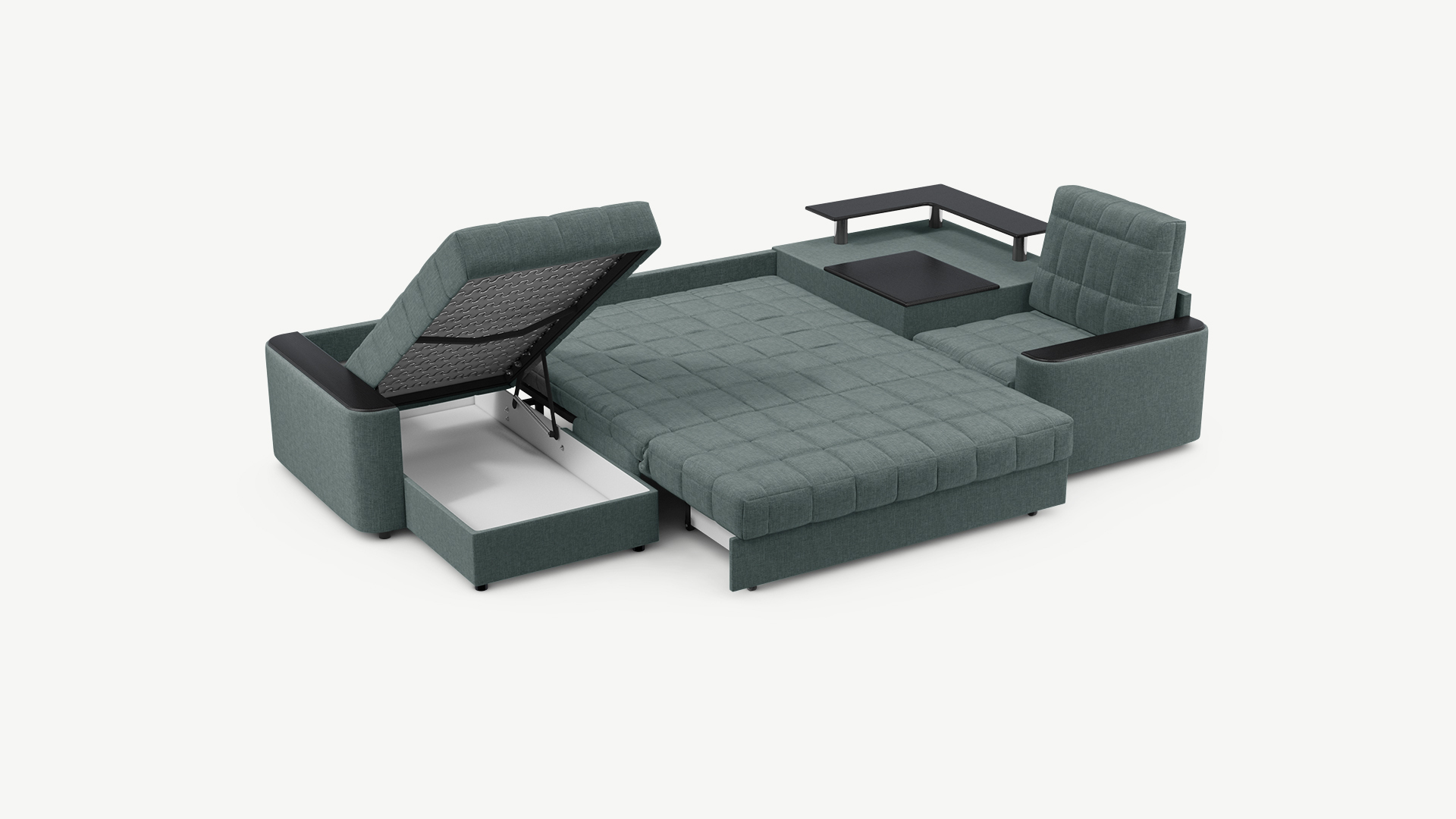 Выбирая угловой диван со столиком, Вы сможете проводить время с максимальным комфортом, многократно повысив функциональность дивана. Все дело в том, что под столешницей модуля расположена вместительная емкость для хранения. Кроме того, поверхность столика — идеальное пространство для чаепития в приятной компании, а также место для множества актуальных мелочей — от ноутбука до косметики.