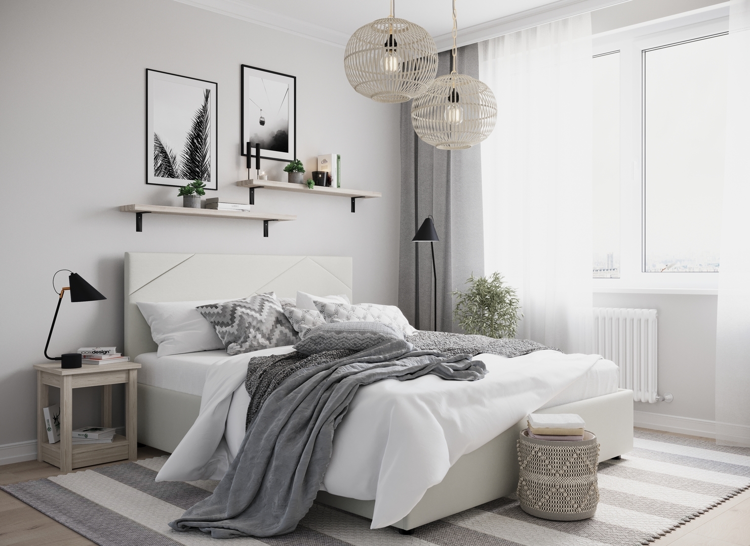 Создать гармоничный интерьер и завершить образ спальни помогут дополнительные аксессуары, например: тумбы, банкетки, подушки.
