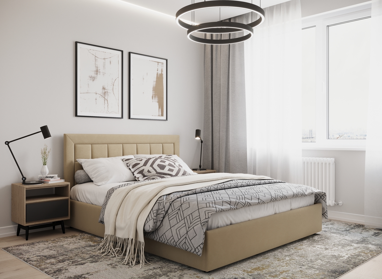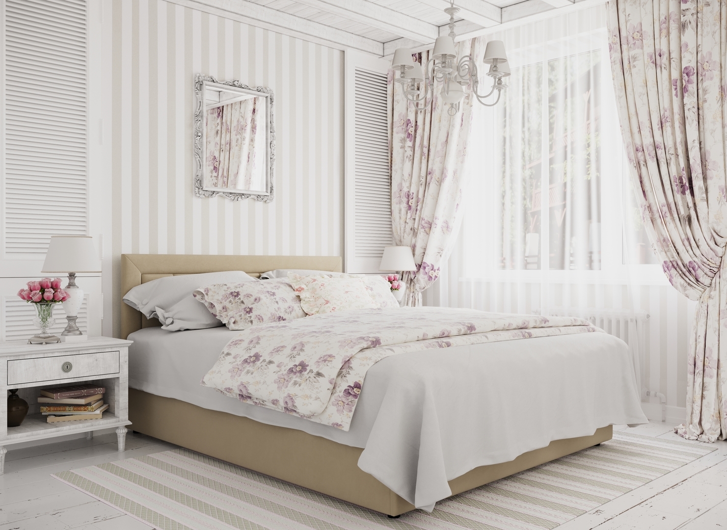 Создать гармоничный интерьер и завершить образ спальни помогут дополнительные аксессуары, например: тумбы, банкетки, подушки.