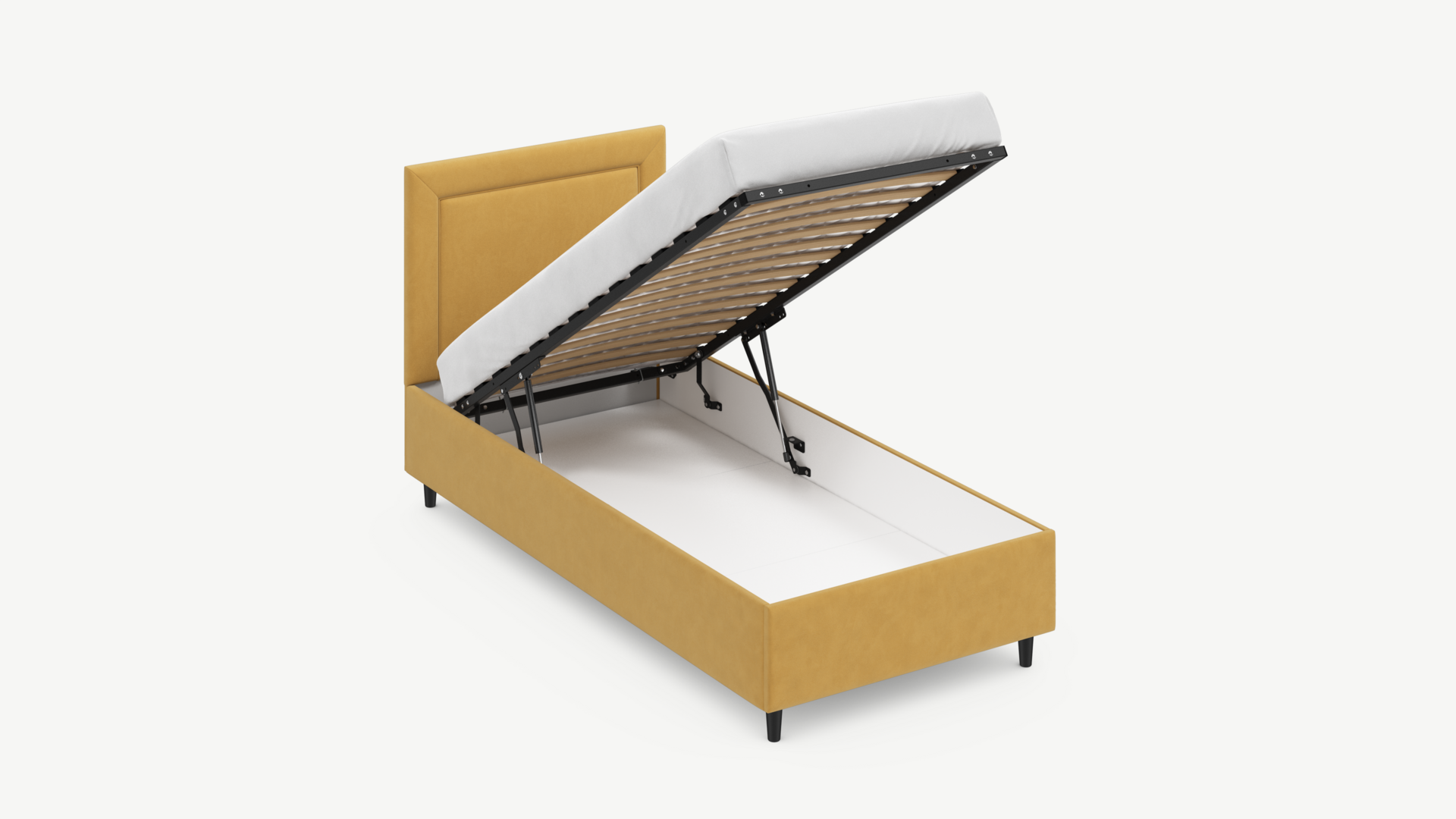 • Скрытая под основанием вместительная емкость без внутренних перегородок позволяет использовать всю площадь подкроватного пространства для хранения вещей.