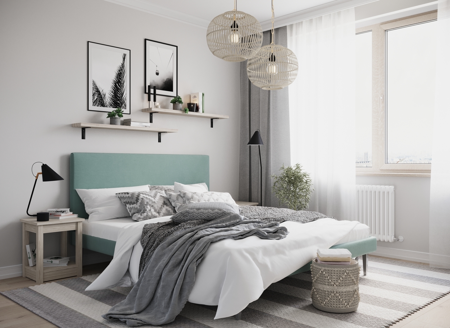 Создать гармоничный интерьер и завершить образ спальни помогут дополнительные аксессуары, например: тумбы, банкетки, подушки.