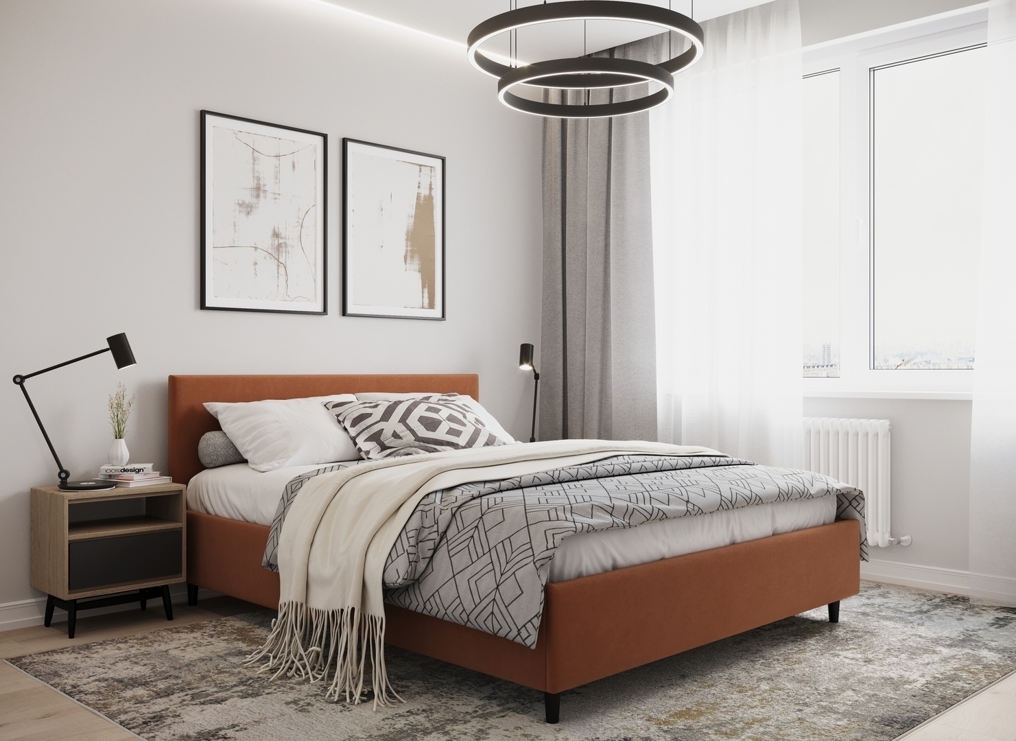 Создать гармоничный интерьер и завершить образ спальни помогут дополнительные аксессуары, например: тумбы, банкетки, подушки.