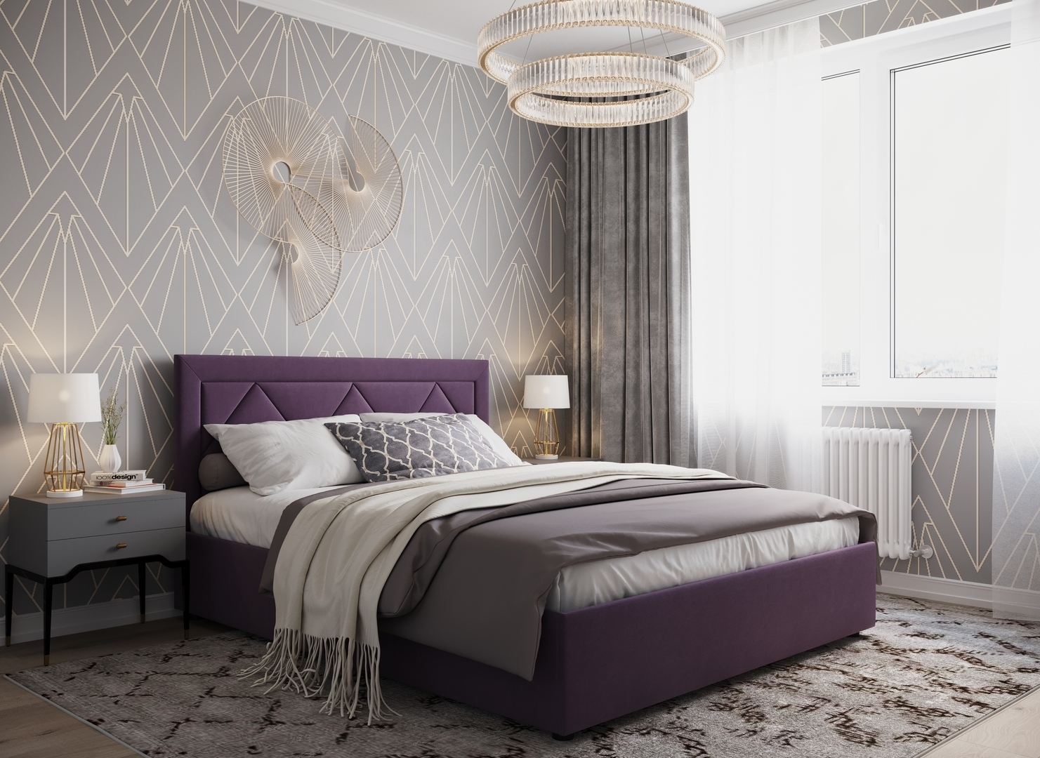 Создать гармоничный интерьер и завершить образ спальни помогут дополнительные аксессуары, например: тумбы, банкетки, подушки.