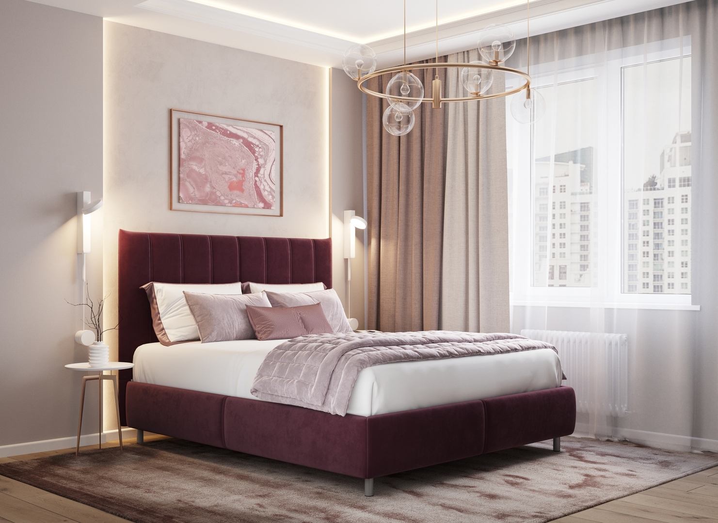 Творчески завершить образ спальни помогут дополнительные аксессуары: декоративные подушки и тумбы.