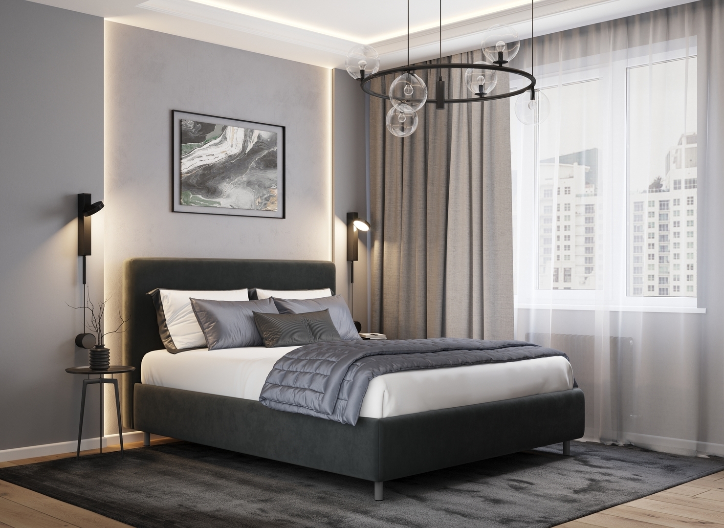Творческий подход к выбору обивочного материала меняет образ дизайна. Велюр за счет своей бархатистой фактуры привносит в пространство шика и утонченности. Шенилл дополняет оформление спальни природными текстурами, создавая атмосферу тепла и уюта.